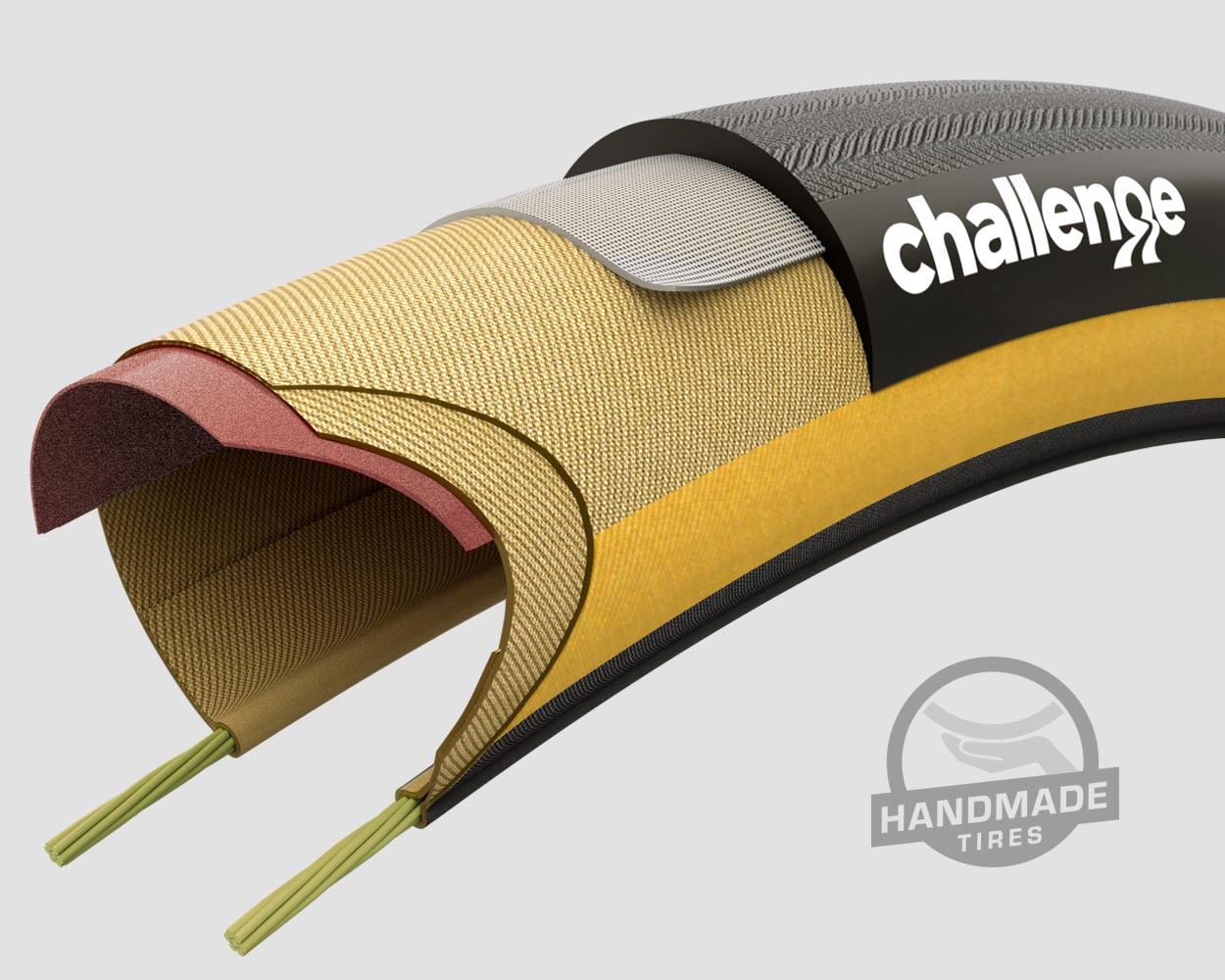 Challenge handmade tires combine comfort, performance and grip in a way other tires can’t match. Unlike tires mass-produced through industrial vulcanization – a process that relies on heavy machinery and minimal labor to heat-mould synthetic butyl rubber and nylon into a tire shape – handmade tires are assembled step-by-step by experienced craftspeople. High quality natural glues and latex coatings are applied to ultra-supple casing materials like silk, cotton, or polyester. The natural rubber tread is moulded and attached with no vulcanization required – the materials maintain their superior characteristics. The result is a small-batch tire with a ride feel that is simply on a different level.