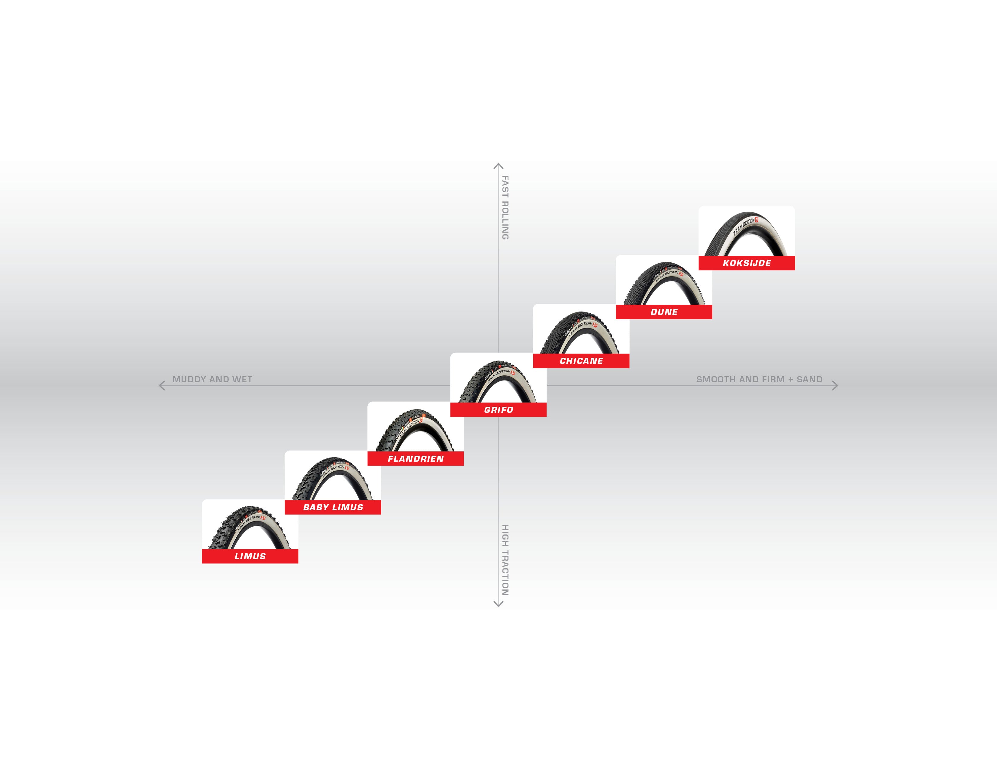 Cyclocross courses encompass a wide variety of conditions, and facing this adversity on a 33mm tread means that tire selection is crucial. Generally speaking, tires are designed to perform on a spectrum between sandy, firm couses to slippery wet mud. The right choice depends on several factors and is influenced largely by riding style!